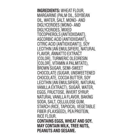 WHEAT FLOUR, MARGARINE (PALM OIL, SOYBEAN OIL, WATER, SALT, MONO-AND DIGLYCERIDES [MONO-AND DIGLYCERIDES, MIXED TOCOPHEROLS (ANTIOXIDANT}, ASCORBIC ACID (ANTIOXIDANT), CITRIC ACID {ANTIOXIDANT}], SOY LECITHIN [AN EMULSIFIER], NATURAL FLAVOR, ANNATTO EXTRACT [COLOR], TURMERIC OLEORESIN [COLOR], VITAMIN A PALMITATE), BROWN SUGAR, SEMI-SWEET CHOCOLATE (SUGAR, UNSWEETENED CHOCOLATE, COCOA BUTTER, SOY LECITHIN [AN EMULSIFIER], NATURAL VANILLA EXTRACT), SUGAR, WATER, EGGS, FRUCTOSE, INVERT SYRUP, NATURAL VANILLA FLAVOR, BAKING SODA, SALT, CELLULOSE GUM, STARCH (RICE, TAPIOCA), VEGETABLE FIBER (FLAXSEED), PEA PROTEIN, RICE FLOUR. CONTAINS EGGS, WHEAT AND SOY. MAY CONTAIN MILK, TREE NUTS, PEANUTS AND SESAME.a