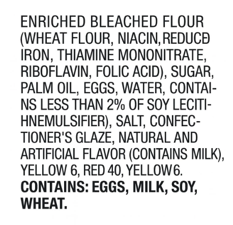ENRICHED BLEACHED FLOUR (WHEAT FLOUR, NIACIN, REDUCED IRON, THIAMINE MONONITRATE, RIBOFLAVIN, FOLIC ACID), SUGAR, PALM OIL, EGGS, WATER, CONTAINS LESS THAN 2% OF SOY LECITHIN (EMULSIFIER), LEAVENING (BAKING SODA, SODIUM ACID PYROPHOSPHATE), SALT, CONFECTIONER'S GLAZE, NATURAL AND ARTIFICIAL FLAVOR (CONTAINS MILK), CARNAUBA WAX, VEGETABLE JUICE (FOR COLOR), YELLOW 6, BLUE 1, YELLOW 5, RED 40, YELLOW 6. CONTAINS: EGGS, MILK, SOY, WHEAT.