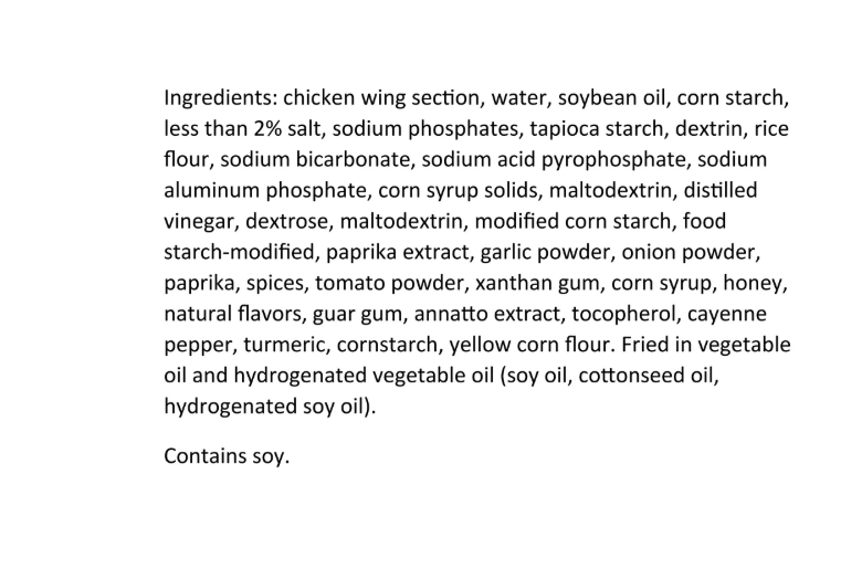 chicken wing section, water, soybean oil, corn starch, less than 2% salt, sodium phosphates, tapioca starch, dextrin, rice flour, sodium bicarbonate, sodium acid pyrophosphate, sodium aluminum phosphate, corn syrup solids, maltodextrin, distilled vinegar, dextrose, maltodextrin, modified corn starch, food starch-modified, paprika extract, garlic powder, onion powder, paprika, spices, tomato powder, xanthan gum, corn syrup, honey, natural flavors, guar gum, annatto extract, tocopherol, cayenne pepper, turmeric, cornstarch, yellow corn flour. Fried in vegetable oil and hydrogenated vegetable oil (soy oil, cottonseed oil, hydrogenated soy oil).