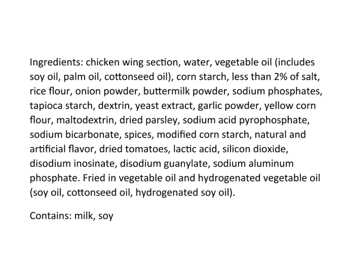 chicken wing section, water, vegetable oil (includes soy oil, palm oil, cottonseed oil), corn starch, less than 2% of salt, rice flour, onion powder, buttermilk powder, sodium phosphates, tapioca starch, dextrin, yeast extract, garlic powder, yellow corn flour, maltodextrin, dried parsley, sodium acid pyrophosphate, sodium bicarbonate, spices, modified corn starch, natural and artificial flavor, dried tomatoes, lactic acid, silicon dioxide, disodium inosinate, disodium guanylate, sodium aluminum phosphate. Fried in vegetable oil and hydrogenated vegetable oil (soy oil, cottonseed oil, hydrogenated soy oil).