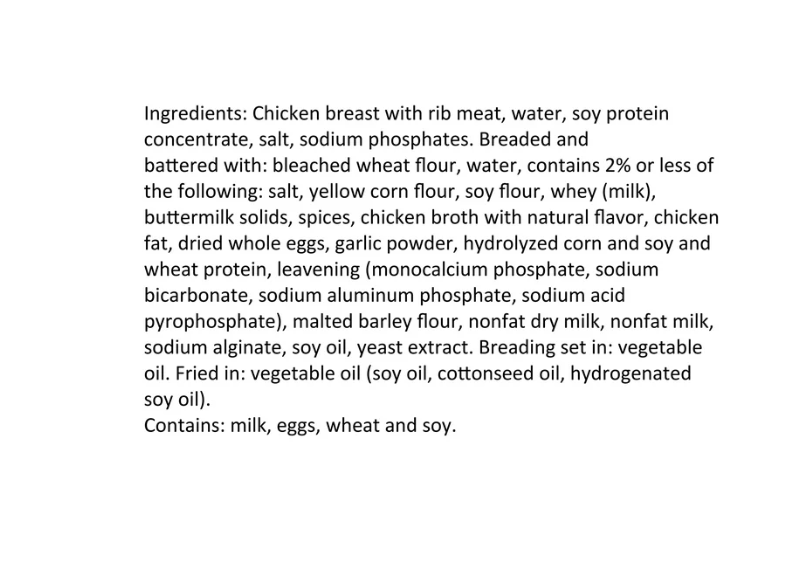 ​Chicken breast with rib meat, water, soy protein concentrate, salt, sodium phosphates. Breaded and battered with: bleached wheat flour, water, contains 2% or less of the following: salt, yellow corn flour, soy flour, whey (milk), buttermilk solids, spices, chicken broth with natural flavor, chicken fat, dried whole eggs, garlic powder, hydrolyzed corn and soy and wheat protein, leavening (monocalcium phosphate, sodium bicarbonate, sodium aluminum phosphate, sodium acid pyrophosphate), malted barley flour, nonfat dry milk, nonfat milk, sodium alginate, soy oil, yeast extract. Breading set in: vegetable oil. Fried in: vegetable oil (soy oil, cottonseed oil, hydrogenated soy oil). Contains: milk, eggs, wheat and soy.