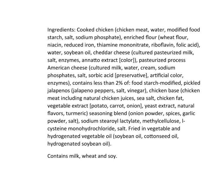 Cooked chicken (chicken meat, water, modified food starch, salt, sodium phosphate), enriched flour (wheat flour, niacin, reduced iron, thiamine mononitrate, riboflavin, folic acid), water, soybean oil, cheddar cheese (cultured pasteurized milk, salt, enzymes, annatto extract [color]), pasteurized process American cheese (cultured milk, water, cream, sodium phosphates, salt, sorbic acid [preservative], artificial color, enzymes), contains less than 2% of: food starch-modified, pickled jalapeños (jalapeño peppers, salt, vinegar), chicken base (chicken meat including natural chicken juices, sea salt, chicken fat, vegetable extract [potato, carrot, onion], yeast extract, natural flavors, turmeric) seasoning blend (onion powder, spices, garlic powder, salt), sodium stearoyl lactylate, methylcellulose, l- cysteine monohydrochloride, salt. Fried in vegetable and hydrogenated vegetable oil (soybean oil, cottonseed oil, hydrogenated soybean oil).