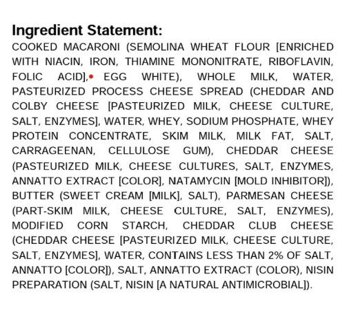 COOKED MACARONI (SEMOLINA WHEAT FLOUR [ENRICHED WITH NIACIN, IRON, THIAMINE MONONITRATE, RIBOFLAVIN, FOLIC ACID],. EGG WHITE), WHOLE MILK, WATER, PASTEURIZED PROCESS CHEESE SPREAD (CHEDDAR AND COLBY CHEESE [PASTEURIZED MILK, CHEESE CULTURE, SALT, ENZYMES], WATER, WHEY, SODIUM PHOSPHATE, WHEY PROTEIN CONCENTRATE, SKIM MILK, MILK FAT, SALT, CARRAGEENAN, CELLULOSE GUM), CHEDDAR CHEESE (PASTEURIZED MILK, CHEESE CULTURES, SALT, ENZYMES, ANNATTO EXTRACT [COLOR], NATAMYCIN [MOLD INHIBITOR]), BUTTER (SWEET CREAM [MILK], SALT), PARMESAN CHEESE (PART-SKIM MILK, CHEESE CULTURE, SALT, ENZYMES), MODIFIED CORN STARCH, CHEDDAR CLUB CHEESE (CHEDDAR CHEESE [PASTEURIZED MILK, CHEESE CULTURE, SALT, ENZYMES], WATER, CONTAINS LESS THAN 2% OF SALT, ANNATTO [COLOR]), SALT, ANNATTO EXTRACT (COLOR), NISIN PREPARATION (SALT, NISIN [A NATURAL ANTIMICROBIAL]).