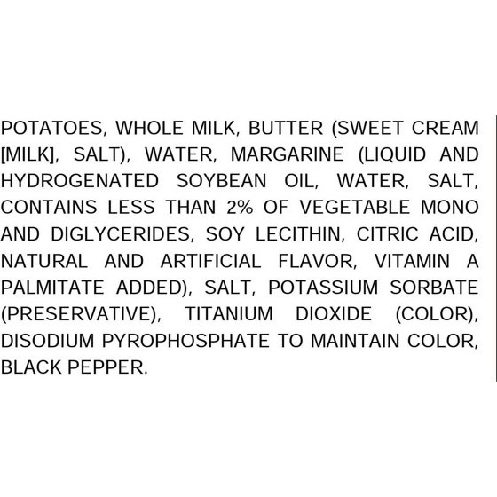 Potatoes, whole milk, butter (sweet cream [milk], salt), water, margarine (liquid and hydrogenated soybean oil, water, salt, contains less than 2% of vegetable mono and diglycerides, soy lecithin, citric acid, natural and artificial flavor, vitamin A Palmitate added), salt, potassium sorbate (preservative), titanium dioxide (color), disodium pyrophosphate to maintian color, black pepper.