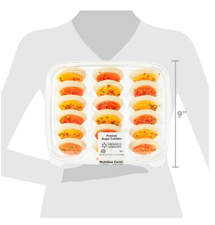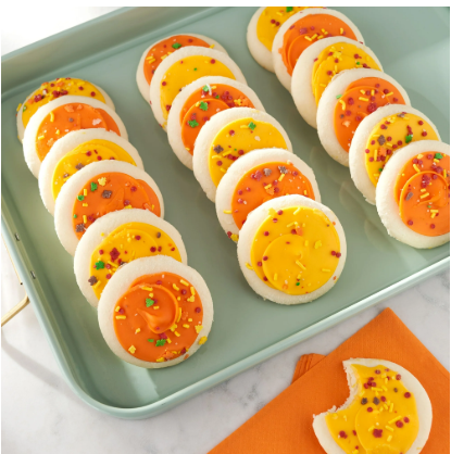 Enjoy the crisp fall air with Freshness Guaranteed Baked Frosted Sugar Cookies. You will get 18 soft and moist sugar cookies with delicious yellow and orange frosting, topped with festive sprinkles. These are great for sharing with friends and family, serving to guests at your next party or get together, or enjoying as a sweet treat on any day.