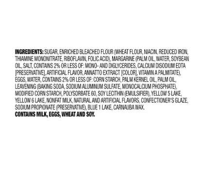 SUGAR, ENRICHED BLEACHED FLOUR (WHEAT FLOUR, NIACIN, REDUCED IRON, THIAMINE MONONITRATE, RIBOFLAVIN, FOLIC ACID), MARGARINE (PALM OIL, WATER, SOYBEAN OIL, SALT, CONTAINS 2% OR LESS OF: MONO- AND DIGLYCERIDES, CALCIUM DISODIUM EDTA [PERSERVATIVE], ARTIFICAL FLAVOR, ANNATTO EXTRACT [COLOR], VITAMIN A PALMITATE), EGGS, WATER, CONTAINS 2% OR LESS OF: CORN STARCH, PALM KERNAL OIL, PALM OIL, LEAVENING (BAKING SODA, SODIUM ALUMINUM SULFATE, MONOCALCIUM PHOSPHATE), MODIFIED CORN STARCH, POLYSORBATE 60, SOY LECITHIN (EMULSIFIER), YELLOW 5 LAKE, YELLOW 6 LAKE, NONFAT MILK, NATURAL AND ARTIFICAL FLAVORS, CONFECTIONER'S GLAZE, SODIUM PROPIONATE (PERSERVATIVE), BLUE 1 LAKE, CARNAUBA WAX.