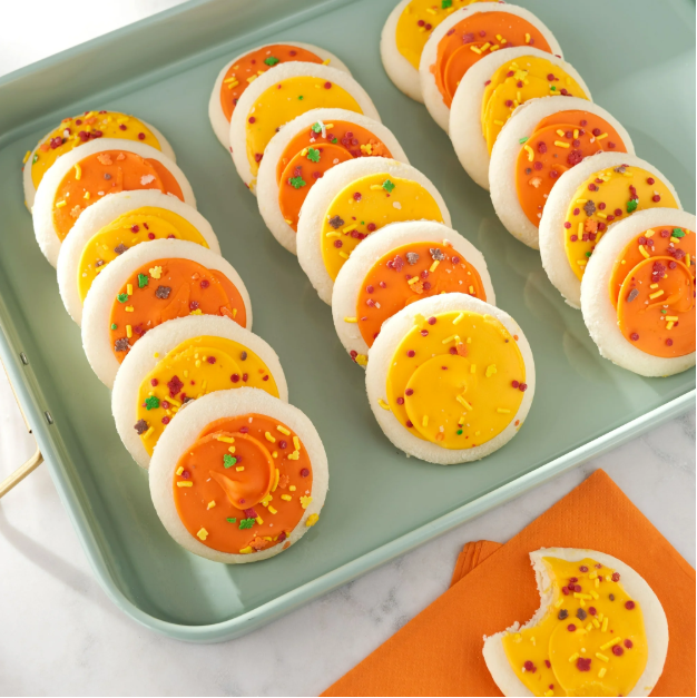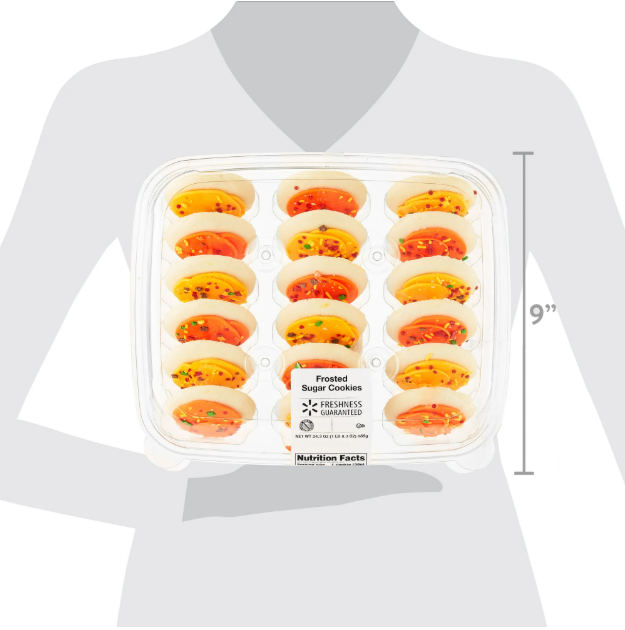 Enjoy the crisp fall air with Freshness Guaranteed Baked Frosted Sugar Cookies. You will get 18 soft and moist sugar cookies with delicious yellow and orange frosting, topped with festive sprinkles. These are great for sharing with friends and family, serving to guests at your next party or get together, or enjoying as a sweet treat on any day.