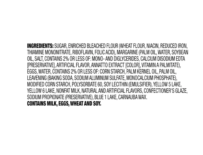 SUGAR, ENRICHED BLEACHED FLOUR (WHEAT FLOUR, NIACIN, REDUCED IRON, THIAMINE MONONITRATE, RIBOFLAVIN, FOLIC ACID), MARGARINE (PALM OIL, WATER, SOYBEAN OIL, SALT, CONTAINS 2% OR LESS OF: MONO- AND DIGLYCERIDES, CALCIUM DISODIUM EDTA [PERSERVATIVE], ARTIFICAL FLAVOR, ANNATTO EXTRACT [COLOR], VITAMIN A PALMITATE), EGGS, WATER, CONTAINS 2% OR LESS OF: CORN STARCH, PALM KERNAL OIL, PALM OIL, LEAVENING (BAKING SODA, SODIUM ALUMINUM SULFATE, MONOCALCIUM PHOSPHATE), MODIFIED CORN STARCH, POLYSORBATE 60, SOY LECITHIN (EMULSIFIER), YELLOW 5 LAKE, YELLOW 6 LAKE, NONFAT MILK, NATURAL AND ARTIFICAL FLAVORS, CONFECTIONER'S GLAZE, SODIUM PROPIONATE (PERSERVATIVE), BLUE 1 LAKE, CARNAUBA WAX.