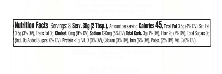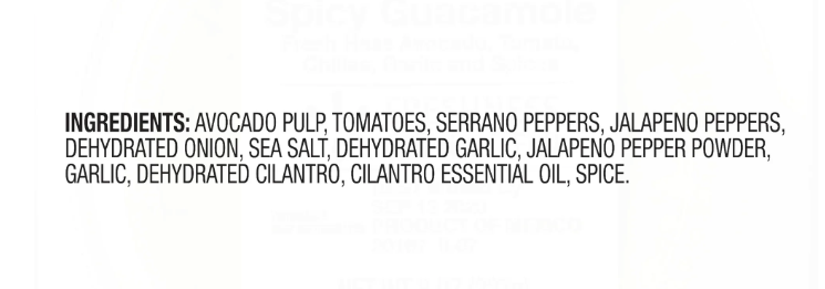 HASS AVOCADO, TOMATO, SERRANO PEPPER, JALAPENO PEPPER, DEHYDRATED ONION, SEA SALT, DEHYDRATED GARLIC, DEHYDRATED JALAPENO PEPPER, GARLIC, DEHYDRATED CILANTRO, CILANTRO ESSENTIAL OIL, SPICE.