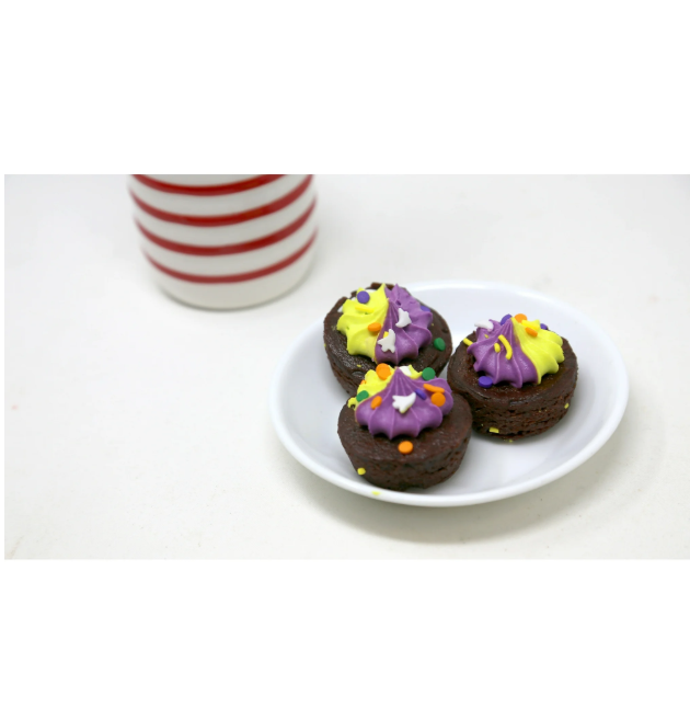 Chewy and moist brownies topped with purple and yellow vanilla icing