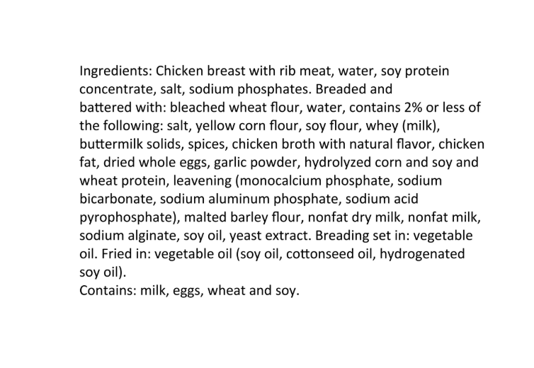 Chicken breast with rib meat, water, soy protein concentrate, salt, sodium phosphates. Breaded and battered with: bleached wheat flour, water, contains 2% or less of the following: salt, yellow corn flour, soy flour, whey (milk), buttermilk solids, spices, chicken broth with natural flavor, chicken fat, dried whole eggs, garlic powder, hydrolyzed corn and soy and wheat protein, leavening (monocalcium phosphate, sodium bicarbonate, sodium aluminum phosphate, sodium acid pyrophosphate), malted barley flour, nonfat dry milk, nonfat milk, sodium alginate, soy oil, yeast extract. Breading set in: vegetable oil. Fried in: vegetable oil (soy oil, cottonseed oil, hydrogenated soy oil). Contains: milk, eggs, wheat and soy.