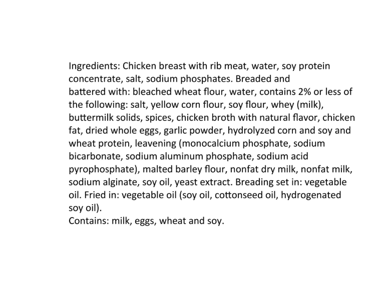 Chicken breast with rib meat, water, soy protein concentrate, salt, sodium phosphates. Breaded and battered with: bleached wheat flour, water, contains 2% or less of the following: salt, yellow corn flour, soy flour, whey (milk), buttermilk solids, spices, chicken broth with natural flavor, chicken fat, dried whole eggs, garlic powder, hydrolyzed corn and soy and wheat protein, leavening (monocalcium phosphate, sodium bicarbonate, sodium aluminum phosphate, sodium acid pyrophosphate), malted barley flour, nonfat dry milk, nonfat milk, sodium alginate, soy oil, yeast extract. Breading set in: vegetable oil. Fried in: vegetable oil (soy oil, cottonseed oil, hydrogenated soy oil). Contains: milk, eggs, wheat and soy.