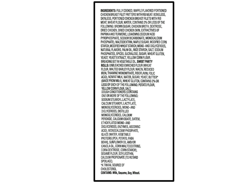 (FULLY COOKED, WAFFLE FLAVORED, PORTIONED CHICKEN BREAST FILET FRITTERS WITH RIB MEAT), BONELESS SKINLESS PORTIONED CHICKEN BREAST FILETS WITH RIB MEAT, WHEAT FLOUR, WATER, CONTAINS 2% OR LESS OF THE FOLLOWING: BROWN SUGAR, CHICKEN BROTH, DEXTROSE, DRIED CHICKEN, DRIED CHICKEN SKIN, EXTRACTIVES OF PAPRIKA AND TURMERIC, LEAVENING (SODIUM ACID PYROPHOSPHATE, SODIUM BICARBONATE, MONOCALCIUM PHOSPHATE), MALTODEXTRIN, MAPLE SUGAR, MODIFIED CORN STARCH, MODIFIED WHEAT STARCH, MONO- AND DIGLYCERIDES, NATURAL FLAVORS, PALM OIL, RICE STARCH, SALT, SODIUM PHOSPHATES, SPICES, SUCRALOSE, SUGAR, WHEAT GLUTEN, YEAST, YEAST EXTRACT, YELLOW CORN FLOUR. BREADING SET IN VEGETABLE OIL. SWEET PARTY ROLLS: UNBLEACHED ENRICHED FLOUR (WHEAT FLOUR, MALTED BARLEY FLOUR, NIACIN, REDUCED IRON, THIAMINE MONONITRATE, RIBOFLAVIN, FOLIC ACID), NONFAT MILK, SUGAR, WATER, UNSALTED BUTTER (PASTEURIZED SWEET CREAM MILK, NATURAL FLAVOR LACTIC ACID), WHEAT GLUTEN, YEAST, CONTAINS 2% OR LESS OF THE FOLLOWING: YELLOW CORN FLOUR, CALCIUM SULFATE, SALT, POTATO FLOUR, DOUGH CONDITIONERS (CONTAINS ONE OR MORE OF THE FOLLOWING: SODIUM STEAROYL LACTYLATE, CALCIUM STEAROYL LACTYLATE, MONOGLYCERIDES, MONO- AND DIGLYCERIDES, DISTILLED MONOGLYCERIDES, CALCIUM PEROXIDE, CALCIUM IODATE, DATEM, ETHOXYLATED MONO- AND DIGLYCERIDES, ENZYMES, ASCORBIC ACID), SOY FLOUR, WHEAT STARCH, SOY LECITHIN, GLAZE (WATER, SUNFLOWER OIL, VEGETABLE PROTEINS PEA, POTATO, AND/OR RICE, WHEAT MALTODEXTRINS, WHEAT DEXTROSE, CORN STARCH), CALCIUM CARBONATE, MONOCALCIUM PHOSPHATE, CALCIUM PROPIONATE (TO RETARD SPOILAGE).
