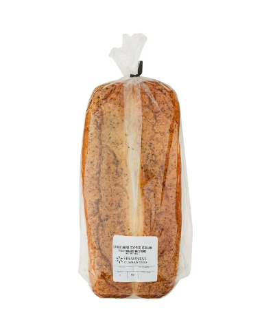 Freshness Guaranteed Italian Bread is a classically delicious loaf that is baked fresh in store and topped with a robust blend of garlic and herbs. This bread is perfect as a side item or used as an ingredient in home cooked meals. Use it to make large, hand-crafted sandwiches piled high with all your favorite meats, veggies and condiments. Slice it up and use it as a base for pizza or simply toast and top with hearty meatballs. Use it to make garlic-butter bread and serve with your favorite Italian-style pasta. Enjoy fresh from the bakery taste in the comfort of your home with Freshness Guaranteed Garlic Herb Topped Italian Bread.