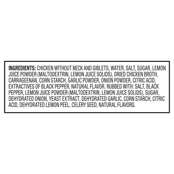 CHICKEN WITHOUT NECK AND GIBLETS, WATER, SALT, SUGAR, LEMON JUICE POWDER (MALTODEXTRIN, LEMON JUICE SOLIDS), DRIED CHICKEN BROTH, CARRAGEENAN, CORN STARCH, GARLIC POWDER, ONION POWDER, CITRIC ACID, EXTRACTIVES OF BLACK PEPPER, NATURAL FLAVOR. RUBBED WITH: SALT, BLACK PEPPER, LEMON JUICE POWDER (MALTODEXTRIN, LEMON JUICE SOLIDS), SUGAR, DEHYDRATED ONION, YEAST EXTRACT DEHYDRATED GARLIC, CORN STARCH, CITRIC ACID, DEHYDRATED LEMON PEEL, CELERY SEED, NATURAL FLAVORS.