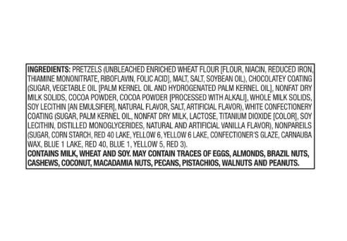 PRETZELS (ENRICHED WHEAT FLOUR [WHEAT FLOUR, NIACIN, REDUCED IRON, THIAMINE MONONITRATE, RIBOFLAVIN, FOLIC ACID], SALT, CONTAINS LESS THAN 2% OF CORN SYRUP, LEAVENING [YEAST, SODIUM BICARBONATE AND/OR AMMONIUM BICARBONATE]), WHITE CONFECTIONERY COATING (SUGAR, PALM KERNEL OIL, NONFAT DRY MILK, LACTOSE, TITANIUM DIOXIDE [COLOR], SOY LECITHIN [AN EMULSIFIER], DISTILLED MONOGLYCERIDES, NATURAL VANILLA FLAVOR), MILK CHOCOLATE COATING (SUGAR, CHOCOLATE LIQUOR, COCOA BUTTER, DRY WHOLE MILK, MILK FAT, SOY LECITHIN [AN EMULSIFIER], NATURAL VANILLA FLAVOR), NONPAREILS (SUGAR, CORN STARCH, RED 40 LAKE, YELLOW 6, YELLOW 6 LAKE, SHELLAC, CARNAUBA WAX , BLUE 1 LAKE, YELLOW 5, RED 3)