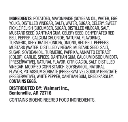 Potatoes, Mayonnaise (Soybean Oil, Water, Egg Yolks, Vinegar, Salt), Water, Sugar, Celery, Sweet Pickle Relish (Cucumber, Sugar, Vinegar, Salt, Mustard Seed, Xanthan Gum, Celery Seed, Dehydrated Red Bell Pepper, Calcium Chloride, Natural Flavoring, Turmeric, Dehydrated Onion), Onions, Red Bell Peppers, Mustard (Water, Vinegar, Mustard Seed, Salt, Sugar, Soybean Oil, Turmeric, Annatto [Color], Garlic, Spices, Xanthan Gum, Calcium Disodium EDTA [Preservative], Natural Flavor, Citric Acid), Salt, Vinegar, Modified Corn Starch, Soybean Oil, Black Pepper, Potassium Sorbate (Preservative), Sodium Benzoate (Preservative), White Pepper, Xanthan Gum, Dried Parsley.