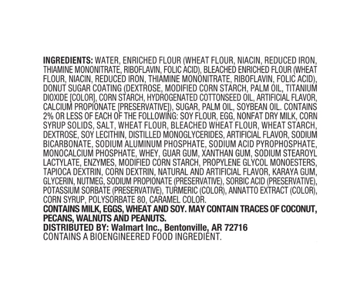 WATER. ENRICHED FLOUR (WHEAT FLOUR. NIACIN. REDUCED IRON, THIAMINE MONONITRATE, MORANN, FOLIC ACID), BLEACHED ENRICHED FLOUR (WHEAT FLOUR, NIACIN, REDUCED IRON, THIAMINE MONONITRATE, RIBOFLAVIN, FOLIC ACID), DONUT SUGAR COATING (DEXTROSE, MODIFIED CORN STARCH, PALM OIL, TITANIUM DIOXIDE [COLOR CORN STARCH, HYDROGENATED COTTONSEED OIL, ARTIFICIAL FLAVOR, CALCIUM PROPIONATE (PRESERVATIVE)). SUGAR, PALM OIL. SOYBEAN OIL. CONTAINS 2% OR LESS OF EACH OF THE FOLLOWING: SOY ROUR, EGG, NONFAT DRY MILK, CORN SYRUP SOLIDS, SALT, WHEAT FLOUR, BLEACHED WHEAT FLOUR, WHEAT STARCH, DEXTROSE, SOY LECITHIN, DISTILLED MONOGLYCERIDES, ARDRCIAL FLAVOR, SODIUM BICARBONATE, SODIUM ALUMINUM PHOSPHATE, SODIUM ACID PYROPHOSPHATE, MONOCALCIUM PHOSPHATE, WHEY. GUM GUM, XANTHAN GUM, SODIUM STEAROYL LACTYLATE, ENZYMES, MODIFIED CORN STARCH, PROPYLENE GLYCOL MONOESTERS, TAPIOCA DEXTRIN, CORN DEXTRIN, NATURAL MD ARTIFICIAL FLAVOR, KARAYA GUM. GLYCERIN, NUTMEG, SODIUM PROPIONATE (PRESERVATIVE), SORBIC ACID (PRESERVATIVE). POTASSIUM SORBATE (PRESERVATIVE), TURMERIC (COLOR), ANNATTO EXTRACT (COLOR). CORN SYRUP, POLYSORBATE 80. CARAMEL COLOR