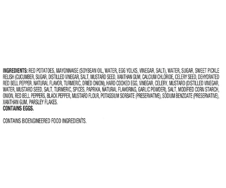 Red Potatoes, Mayonnaise (Soybean Oil, Water, Egg Yolks, Vinegar, Salt), Water, Sugar, Sweet Pickle Relish (Cucumber, Sugar, Distilled Vinegar, Salt, Mustard Seed, Xanthan Gum, Calcium Chloride, Celery Seed, Dehydrated Red Bell Pepper, Natural Flavor, Turmeric, Dried Onion), Hard Cooked Egg, Vinegar, Celery, Mustard (Distilled Vinegar, Water, Mustard Seed, Salt, Turmeric, Spices, Paprika, Natural Flavoring, Garlic Powder), Salt, Modified Corn Starch, Onion, Red Bell Peppers, Black Pepper, Mustard Flour, Potassium Sorbate (Preservative), Sodium Benzoate (Preservative), Xanthan Gum, Parsley Flakes.