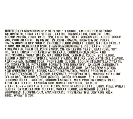 SUGAR, ENRICHED FLOUR (WHEAT FLOUR, MALTED BARLEY FLOUR, NIACIN, REDUCED IRON, THIAMINE MONONITRATE, RIBOFLAVIN, FOLIC ACID), WATER, PALM OIL, SOYBEAN OIL, CONTAINS 2% OR LESS OF EACH OF THE FOLLOWING: SALT, COCOA PROCESSED WITH ALKALI, CORNSTARCH, MONO- AND DIGLYCERIDES, WHEY (MILK), MALTODEXTRIN, CARAMEL COLOR, SOY FLOUR, SODIUM ACID PYROPHOSPHATE, WHEAT STARCH, NATURAL AND ARTIFICIAL FLAVOR, POLYSORBATE 60, POTASSIUM SORBATE (PRESERVATIVE), CALCIUM CARBONATE, SODIUM PROPIONATE (PRESERVATIVE), SODIUM BENZOATE (PRESERVATIVE), LACTIC ACID (PRESERVATIVE), MILK PROTEIN ISOLATE, BETA CAROTENE (COLOR), SODIUM BENZOATE (PRESERVATIVE), MICROCRYSTALLINE CELLULOSE, TITANIUM DIOXIDE (COLOR), DRIED WHOLE EGG, WHEY, MILK PROTEIN CONCENTRATE, ARTIFICIAL FLAVOR, XANTHAN GUM, NONFAT DRY MILK, CALCIUM SULFATE, CALCIUM STEAROYL-2-LACTYLATE, WHEAT FLOUR, AMMONIUM SULFATE, EGG WHITES, TOCOPHEROLS, ASCORBIC ACID (PRESERVATIVE).