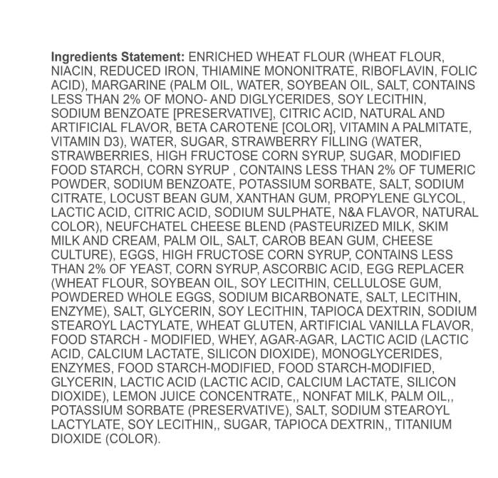 ENRICHED WHEAT FLOUR (WHEAT FLOUR, NIACIN, REDUCED IRON, THIAMINE MONONITRATE, RIBOFLAVIN, FOLIC ACID), MARGARINE (PALM OIL, WATER, SOYBEAN OIL SALT, CONTAINS LESS THAN 2% OF MONO- AND DIGLYCERIDES, SOY LECITHIN, SODIUM BENZOATE [PRESERVATIVE], CITRIC ACID, NATURAL AND ARTIFICIAL FLAVOR, VITAMIN A PALMITATE, BETA CAROTENE [COLOR], VITAMIN D3), STRAWBERRY FILLING (WATER, STRAWBERRIES, HIGH FRUCTOSE CORN SYRUP, SUGAR, FOOD STARCH-MODI-FIED, CORN SYRUP, CONTAINS 2% OR LESS OF: PROPYLENE GLYCOL, NATURAL FLAVORS, CITRIC ACID, SODIUM BENZOATE AND POTASSIUM SORBATE [AS PRESERVATIVES], SALT, LOCUST BEAN GUM, SODIUM CITRATE, XANTHAN GUM, RED 40, LACTIC ACID, ALUMINUM SODIUM SULPHATE, BLUE 1), WATER, SUGAR, EGGS, NEUFCHATEL CHEESE (CULTURED PASTEURIZED MILK AND CREAM, SALT, CAROB BEAN GUM), HIGH FRUCTOSE CORN SYRUP, CONTAINS 2% OR LESS OF: NONFAT MILK, CORN SYRUP, YEAST, PALM OIL, MONOGLYCERIDES, SALT, GLYCERINE, FOOD STARCH-MODIFIED, MICROCRYSTALLJNE CELLULOSE, TAPIOCA DEXTRIN, SODIUM STEAROYL LACTYLATE, ARTIFICIAL FLAVOR, WHEY, POTASSIUM SORBATE (PRESERVATIVE), LACTIC ACID, SOYBEAN OIL, AGAR-AGAR, CALCIUM LACTATE, LEMON JUICE CONCENTRATE, SOY LECITHIN, CELLULOSE GUM, BAKING SODA, ENZYMES, TITANIUM DIOXIDE (FOR COLOR), XANTHAN GUM, ASCORBIC ACID. CONTAINS MILK, EGGS, WHEAT AND SOY.
