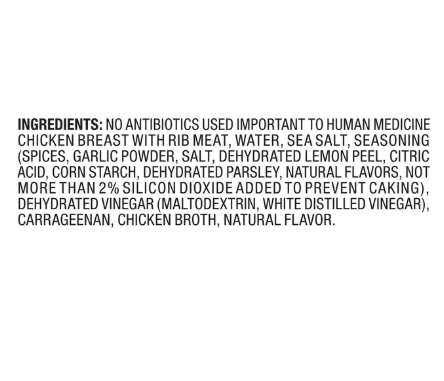 No Antibiotics Ever Used Chicken Breast (Chicken Breast with Rib Meat, Water, Sea Salt, Potassium Carbonate, Dehydrated, Chicken Broth, Carrageenan), Citrus Herb Rub Spices, Garlic Powder, Salt, Dehydrated Lemon Peel, Citric Acid, Corn, Starch, Dehydrated Parsley, Natural Flavors, not more than 2% silicon dioxide added to prevent caking.