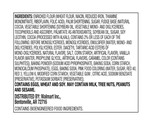Ingredients:Enriched Flour(Wheat Flour, Niacin, Reduced Iron, Thiamine Mononitrate, Riboflavin, Folic Acid), Palm Shortening, Sugar, Fudge Base(Natural Cocoa, Vegetable Shortening[Soybean Oil, Vegetable Mono- and Diglycerides, Tocopherols and Ascorbyl Palmitate as Antioxidants], Soybean Oil, Sugar, Soy Lecithin, Cocoa (Processed with Alkali), Contains 2% or less of the following: Monoglycerides, Emulsifier[Water, Mono- and Diglycerides, Polyglycerol Ester, Diacetyl Tartaric Acid Esters of Mono-Diglycerides, Natural Flavor], Salt, Corn Starch, Artificial Flavor), Vanilla Flavor(Water, Propylene Glycol, Artificial Flavors, Caramel Color [Contains Sulphites]), Baking Powder(Sodium Acid Pyrophosphate, Baking Soda, Corn Starch, Monocalcium Phosphate), Egg, Baking Soda, Pink Food Coloring(Water, Sugar, Red 40, Red 3, Yellow 6, Modified Corn Starch, Vegetable Gum, Citric Acid, Sodium Benzoate [Preservative], Potassium Sorbate [Preservative]).