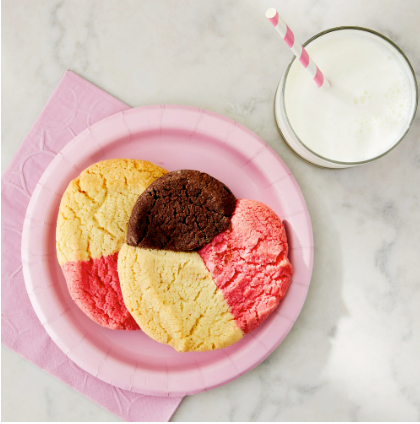 - Includes three large cookies in classic pink, yellow, and chocolate colors