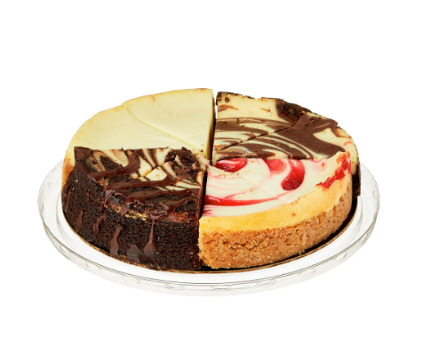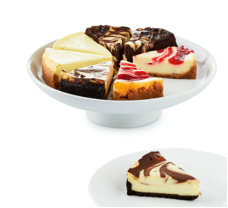 - Two slices of each flavor: New York Style, Strawberry Swirl, Chocolate Marble, Brownie