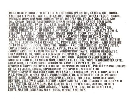 SUGAR, VEGETABLE SHORTENING (PALM OIL, CANOLA OIL, MONO- AND DIGLYCERIDES), WATER, BLEACHED ENRICHED FLOUR (WHEAT FLOUR, NIACIN, REDUCED IRON, THIAMINE MONONITRATE, RIBOFLAVIN, FOLIC ACID), EGGS, SOY OIL, CREAM CHEESE (PASTEURIZED MILK AND CREAM, CHEESE CULTURE, SALT), CRAB BEAN GUM, HIGH FRUCTOSE CORN SYRUP, DEXTROSE, FOOD STARCH-MODIFIED, SODIUM CITRATE, CITRIC ACID, LEMON PUREE, SALT, NATURAL & ARTIFICIAL FLAVOR, AGAR-AGAR, COLOR (YELLOW 6, BLUE 1), CORN SYRUP, INVERT SUGAR, COCOA PROCESSED WITH ALKALI, GUM ACACIA, SPRAY DRIED SKIM MILK, PROTEIN CONCENTRATE, SALT, RASPBERRIES, STRAWBERRY, EGG WHITES, COCOA BUTTER, MILK, BUTTER OIL, SOY LECITHIN (AS AN EMULSIFIER), PALM KERNEL OIL, PROPYLENE GLYCOL MONO- AND DIESTERS OF FATS AND FATTY ACIDS, ARTIFICIAL FLAVOR, BAKING SODA, SODIUM ACID PYROPHOSPHATE, SODIUM ALUMINUM PHOSPHATE, POWDERED CELLULOSE, MONOGLYCERIDES, SODIUM STEAROYL LACTYLATE, SOYBEAN OIL, COLOR (RED 3, RED 40, TITANIUM DIOXIDE), CORN SYRUP SOLIDS, CALCIUM PROPIONATE (AS A PRESERVATIVE), CELLULOSE GUM, POLYSORBATE 60, SODIUM STEAROYL FUMARATE, CALCIUM SULFATE, CALCIUM SULFATE, SALT, WHEY, NATURAL FLAVOR, SODIUM CITRATE, MODIFIED CORN STARCH, MONO- AND DIGLYCERIDES, SODIUM STEAROYL FUMARATE, SODIUM STEAROYL LACTYLATE, RED 40, YELLOW 5, BLUE 1, BLUE 2, LACTIC ACID, MONO- AND DIGLYCERIDES, POLYGLYCEROL ESTERS OF FATTY ACIDS, VANILLIN, CELLULOSE GUM, GUM ARABIC, POLYSORBATE 60, EGG YOLKS, ARTIFICIAL FLAVOR, CALCIUM LACTATE, SODIUM BICARBONATE, SOY LECITHIN, WHOLE MILK POWDER, HEAT MILK, PHOSPHORIC ACID, CALCIUM SULFATE, AMMONIUM BICARBONATE, CALCIUM SULFATE, POTASSIUM SORBATE (AS A PRESERVATIVE), HYDROLYZED SOY PROTEIN, GELATIN, GUAR GUM, MALIC ACID, SULFUR DIOXIDE, SUGAR, ACID, BLUE 1, LAKE YELLOW 6, LAKE YELLOW 5, LAKE BLUE 2, TARTARIC ACID, CALCIUM SULFATE, ETHYL MALTOL.