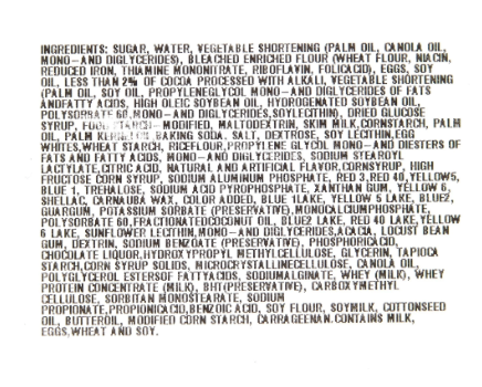 SUGAR, VEGETABLE SHORTENING (PALM OIL, CANOLA OIL, MONO- AND DIGLYCERIDES), WATER, BLEACHED ENRICHED FLOUR (WHEAT FLOUR, NIACIN, REDUCED IRON,THIAMINE MONONITRATE, RIBOFLAVIN, FOLICACID), BLEACHED ENRICHED FLOUR (WHEATFLOUR, MALTED BARLEY FLOUR, NIACIN, REDUCED IRON, THIAMINE MONONITRATE, RIBOFLAVIN, FOLIC ACID), SOY OIL, EGGS, HIGHFRUCTOSE CORN SYRUP, LESS THAN 2% EGG WHITES, COCOA PROCESSED WITH ALKALI,CORNSYRUP, CORNSTARCH, SKIM MILK, SALT, PALM OIL, PROPYLENE GLYCOL MONO- ANDDIESTERS OF FATS AND FATTY ACIDS, MONO- ANDDIGLYCERIDES, SOY LECITHIN, FOODSTARCH-MODIFIED, NATURAL & ARTIFICIALFLAVOR,SORBITAN MONOSTEARATE, PRESERVATIVES (SODIUM PROPIONATE, PHOSPHORIC ACID, PROPIONIC ACID, POTASSIUM SORBATE,SODIUM BENZOATE, BENZOIC ACID), POLYSORBATE 60,BAKING SODA, MEDIUM-CHAIN TRIGLYCERIDES, BLUE 2 LAKE, YELLOW 5 LAKE, RED 40LAKE, SUNFLOWER LECITHIN, YELLOW 6 LAKE, GUAR GUM, WHEAT STARCH, YELLOW 5, SODIUM ACID PYROPHOSPHATE, SODIUM ALUMINUM PHOSPHATE, BLUE 1, PALM KERNEL OIL, RED 3, DEXTROSE, XANTHAN GUM,TAPIOCA STARCH, WHEY (MILK),PROPYLENE GLYCOL MONOESTERS, SODIUM STEAROYL LACTYLATE, CORNSYRUP SOLIDS, CELLULOSE GUM,CALCIUM SULFATE, YELLOW 6, RED 40, MONOCALCIUM PHOSPHATE, CHOCOLATE LIQUOR,ARTIFICIAL COLOR, GLYCERIN, MICROCYRSTALLINE CELLULOSE, RICE FLOUR, WHEAT PROTEIN ISOLATE,GLUCOSE SYRUP, POLYGLYCEROL ESTERS OF FATTY ACIDS, DATEM, SHELLAC, CARNAUBA WAX, PROPYLENE GLYCOL, CANOLA OIL, DEXTRIN, ALUMINUM SULFATE, ACACIA, TAPIOCA FLOUR, BLUE 1 LAKE, WHEATFLOUR, SOY FLOUR, TAPIOCA SYRUP, COCONUT OIL, SODIUMALGINATE, SODIUM ALUMINUM SULFATE, CITRIC ACID, GELATIN, TARTARIC ACID, CARRAGEENAN, MALTODEXTRIN, COTTONSEED OIL, SORBIC ACID (PRESERVATIVE), TITANIUM DIOXIDE (COLOR).