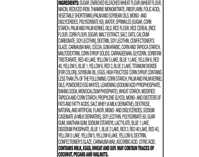 SUGAR, ENRICHED BLEACHED WHEAT FLOUR (FLOUR, NIACIN, REDUCED IRON, THIAMINE MONONITRATE, RIBOFLAVIN, FOLIC ACID), VEGETABLE SHORTENING (PALM AND SOYBEAN OILS, MONO- AND DIGLYCERIDES, POLYSORBATE 60), WATER, EGG WHITES, SOYBEAN OIL, EGGS, SPRINKLES (SUGAR, CORN AND TAPIOCA STARCH, PALM AND PALM KERNEL OILS, RICE FLOUR, COCOA, RICE CEREAL [RICE FLOUR, CORN FLOUR, SUGAR, MALT EXTRACT, SALT, OATS, CALCIUM CARBONATE, SOY LECITHIN], SOY LECITHIN, DEXTRIN, CONFECTIONER'S GLAZE, GUM ARABIC, MALTODEXTRIN, CELLULOSE GUM, CORN SYRUP SOLIDS, CARRAGEENAN, XANTHAN GUM, BLUE 1 LAKE, CARNAUBA WAX, NATURAL AND ARTIFICIAL FLAVOR, YELLOW 6, TITANIUM DIOXIDE [FOR COLOR], YELLOW 5 LAKE, GLYCERIN, RED 40 LAKE, YELLOW 5, RED 40, MONO- AND DIGLYCERIDES, RED 3, BLUE 1, YELLOW 6 LAKE, POLYSORBATE 60, SORBITAN TRISTEARATE, BLUE 2 LAKE), HIGH FRUCTOSE CORN SYRUP, CONTAINS LESS THAN 2% OF THE FOLLOWING: LEAVENING (SODIUM ACID PYROPHOSPHATE, BAKING SODA, MONOCALCIUM PHOSPHATE), WHEAT STARCH, MODIFIED TAPIOCA AND CORN STARCH, PROPYLENE GLYCOL MONO- AND DIESTERS OF FATS AND FATTY ACIDS, SALT, WHEY (A MILK DERIVATIVE), NATURAL AND ARTIFICIAL FLAVOR, DEXTROSE, MONO- AND DIGLYCERIDES, SODIUM CASEINATE (A MILK DERIVATIVE), SOY LECITHIN, GUAR GUM, POLYSORBATE 60, XANTHAN GUM, SODIUM STEAROYL LACTYLATE, BLUE 1 LAKE, YELLOW 5 LAKE, BEET JUICE (FOR COLOR), RED 40 LAKE, YELLOW 6 LAKE, YELLOW 6, YELLOW 5, BLUE 1, RED 3, DISODIUM PHOSPHATE, ASCORBIC ACID, CITRIC ACID.