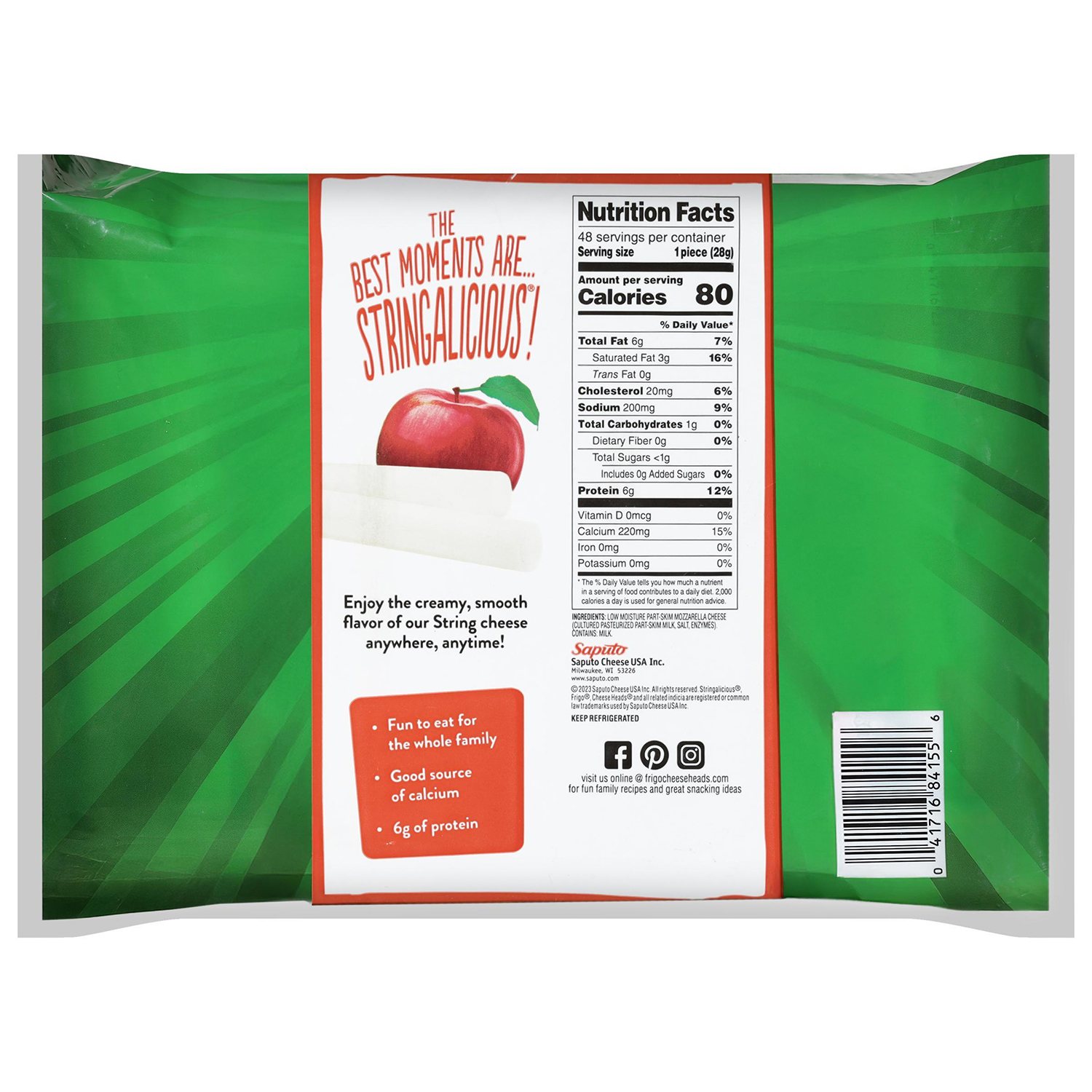 Each delicious Frigo cheese stick is made with low-moisture part-skim mozzarella cheese. There is only 80 calories per serving, as well as 6 grams of protein, 15% of your daily calcium needs and only 1 gram of carbohydrate, making Frigo string cheese a healthy snack option.