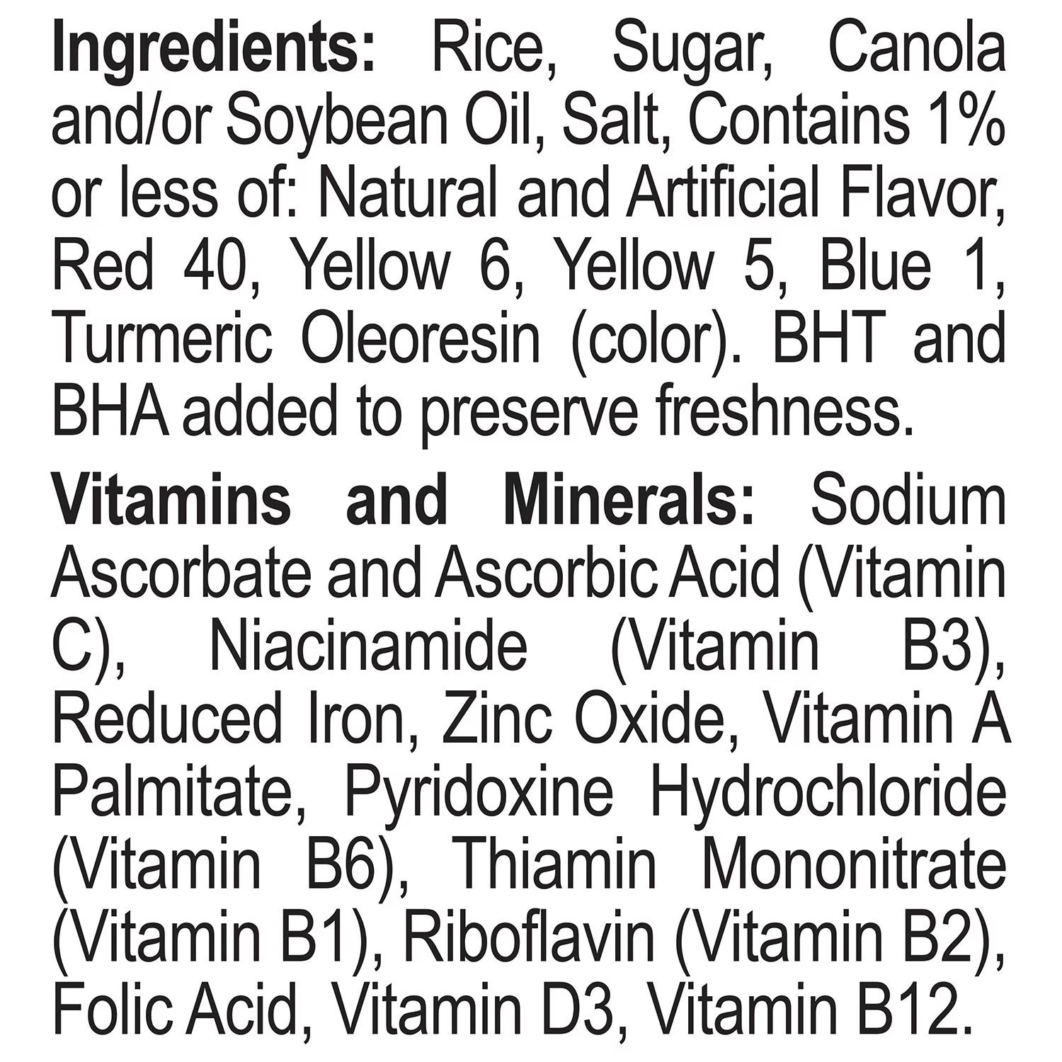 Ingredients: Rice, Sugar, Canola Oil, Salt, Natural and Artificial Flavor, Red 40, Yellow 6, Yellow 5, Turmeric Oleoresin (color), Blue 1, Blue 2, BHT and BHA added to preserve freshness.