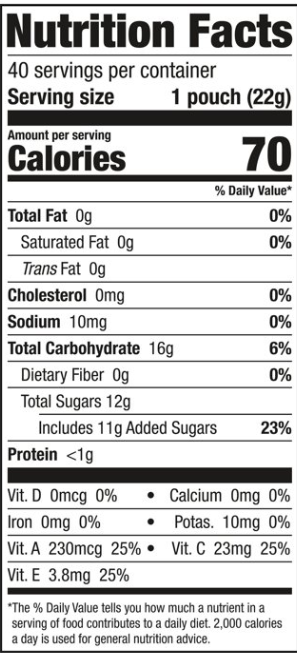 CORN SYRUP, SUGAR, APPLE PUREE CONCENTRATE, WATER, MODIFIED FOOD STARCH, GELATIN, CONTAINS 2% OR LESS OF CITRIC ACID, ASCORBIC ACID (VITAMIN C), FRUIT AND VEGETABLE JUICE (COLOR), VEGETABLE OIL (PALM, COCONUT)*, ALPHA TOCOPHEROL ACETATE (VITAMIN E), NATURAL FLAVORS, CARNAUBA WAX*, VITAMIN A PALMITATE.*ADDS A TRIVAL AMOUNT OF FAT.