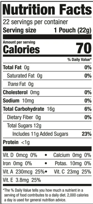 CORN SYRUP, SUGAR, APPLE PUREE CONCENTRATE, WATER, MODIFIED FOOD STARCH, GELATIN, CONTAINS 2% OR LESS OF CITRIC ACID, ASCORBIC ACID (VITAMIN C), VEGETABLE OIL (PALM, COCONUT)*, FRUIT AND VEGETABLE JUICE (COLOR), ALPHA TOCOPHEROL ACETATE (VITAMIN E), NATURAL FLAVORS, CARNAUBA WAX*, VITAMIN A PALMITATE. *ADDS A TRIVIAL AMOUNT OF FAT.