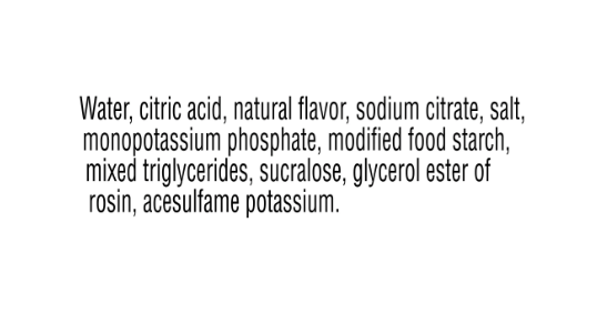 Water, Citric Acid, Natural Flavor, Sodium Citrate, Salt, Monopotassium Phosphate, Modified Food Starch, Mixed Triglycerides, Sucralose, Glycerol Ester of Rosin, Acesulfame Potassium.