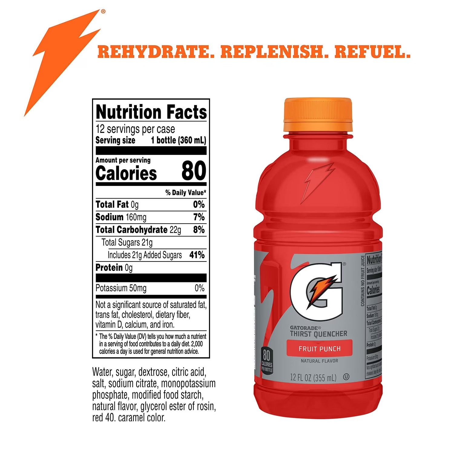 Fruit Punch Ingredients: water, sugar, dextrose, citric acid, salt, sodium citrate, monopotassium phosphate, modified food starch, natural flavor, red 40, glycerol ester of rosin, caramel color