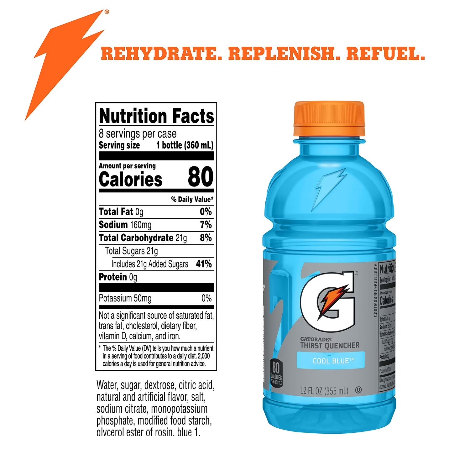 Cool Blue Ingredients: water, sugar, dextrose, citric acid, natural and artificial flavor, salt, sodium citrate, monopotassium phosphate, modified food starch, glycerol ester of rosin, blue 1