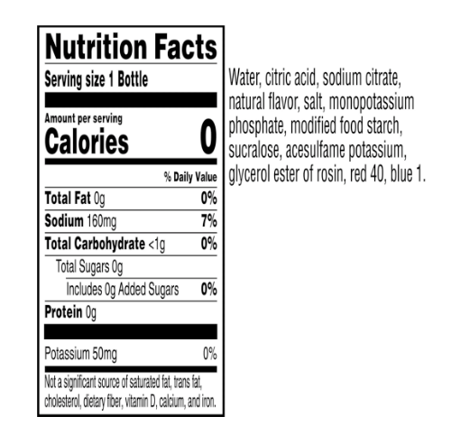 Water, Citric Acid, Sodium Citrate, Natural Flavor, Salt, Monopotassium Phosphate, Modified Food Starch, Sucralose, Acesulfame Potassium, Glycerol Ester of Rosin, Red 40, Blue 1.