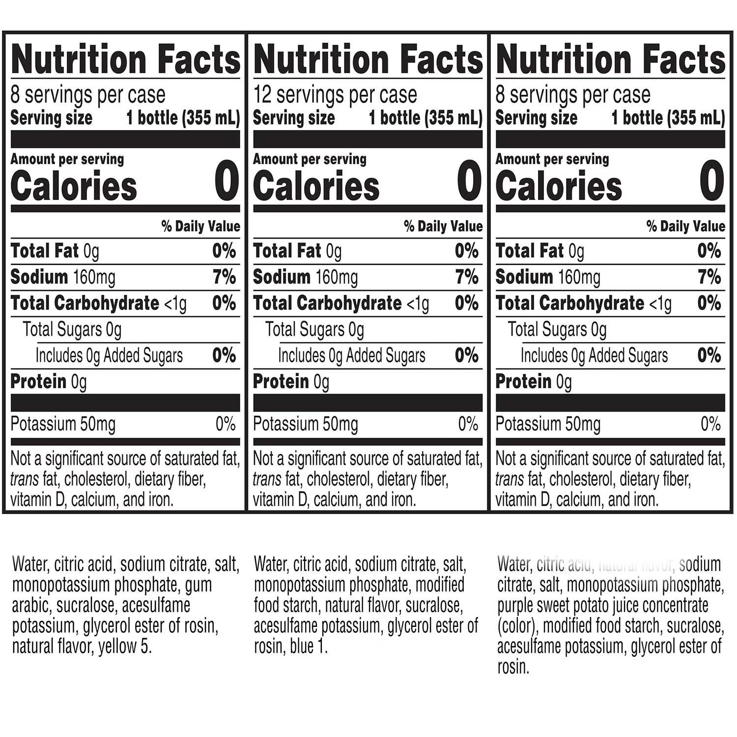 Berry Ingredients: Water, citric acid, natural flavor, sodium citrate, salt, monopotassium phosphate, purple sweet potato juice concentrate (color), modified food starch, sucralose, acesulfame potassium, glycerol ester of rosin.