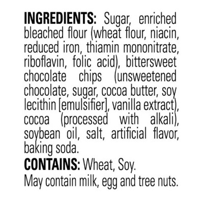 Sugar, enriched bleached flour (wheat flour, niacin, reduced iron, thiamin mononitrate, riboflavin, folic acid), bittersweet chocolate chips (unsweetened chocolate, sugar, cocoa butter, soy lecithin [emulsifier], vanilla extract), cocoa (processed with alkali), soybean oil, salt, artificial flavor, baking soda. Contains: Wheat, Soy. May Contain Milk, Eggs And Tree Nuts.