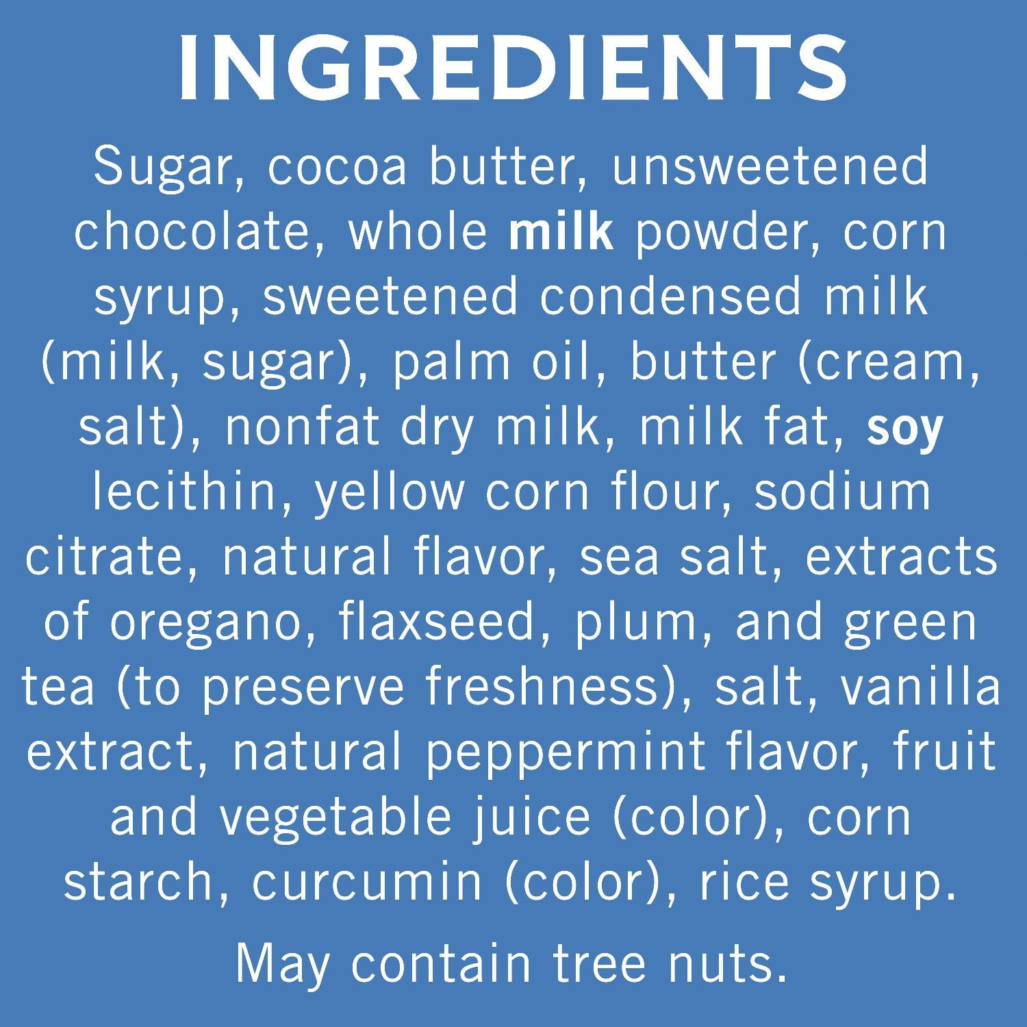 Ingredients: Sugar, Cocoa Butter, Unsweetened Chocolate, Whole Milk Powder, Corn Syrup, Sweetened Condensed Milk (Milk, Sugar), Palm Oil, Butter (Cream, Salt), Nonfat Dry Milk, Milk Fat, Soy Lecithin, Yellow Corn Flour, Sodium Citrate, Natural Flavor, Sea Salt, Extracts Of Oregano, Flaxseed, Plum, And Green Tea (To Preserve Freshness), Salt, Vanilla Extract, Natural Peppermint Flavor, Fruit And Vegetable Juice (Color), Corn Starch, Curcumin (Color), Rice Syrup.