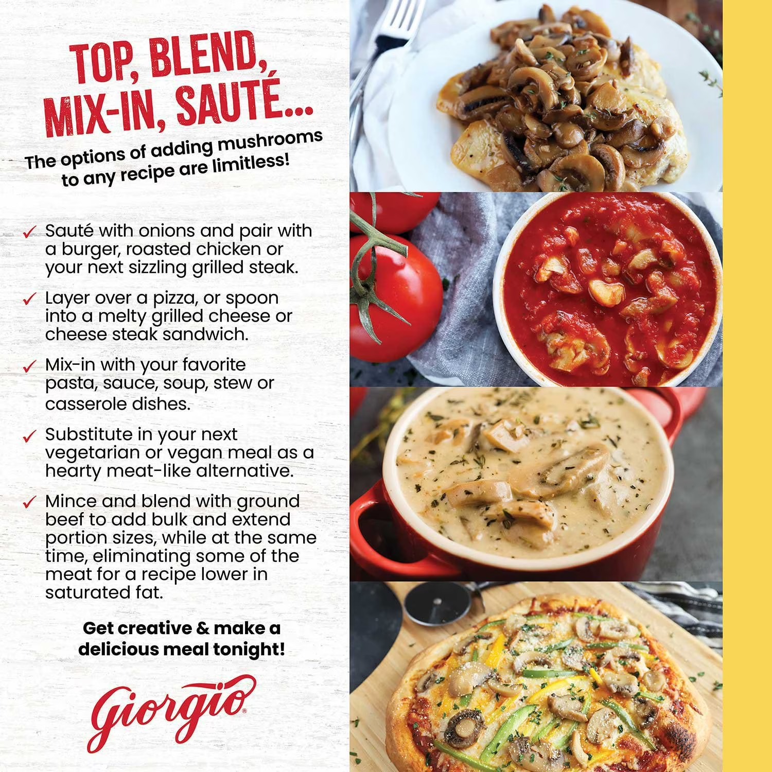 Top, Blend, Mix-in, Sauté… The options of adding mushrooms to any recipe are limitless!