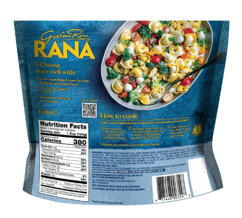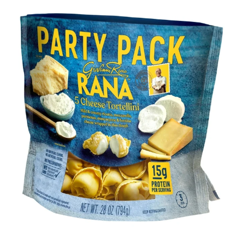 Savor Rana's 5 Cheese Tortellini in a generous 28oz serving. Each piece is filled with a luxurious blend of ricotta, mozzarella, Parmesan, Asiago, and Romano cheeses. Revel in its artisan-crafted texture, which perfectly complements any meal, whether it’s a simple dinner or a festive gathering. This Italian delicacy brings an exceptional depth of flavor and a touch of gourmet elegance to your table. Treat yourself to this exquisite culinary masterpiece. Regular. Refrigerated/Chilled. Refer to packaging for allergens.