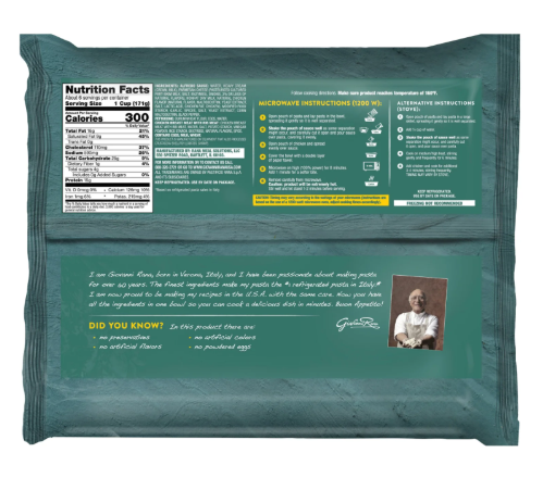 Feeling creative? **Try these ideas: **This kit has all the ingredients you need for Chicken Alfredo, but here are some extra tips! **Make It Green **Sneak in a serving of vegetables by adding blanched broccoli, peas, or sautéed spinach - they'll taste better covered in alfredo sauce! **Make It Spicy **Sprinkle in black pepper or red chili flakes to bring a little heat. The creamy alfredo sauce will help cool down the spice! **Make It Crunchy **Top off the finished dish with some toasted breadcrumbs to add a bit of texture and crunch! **Cooking Instructions - General **Follow cooking directions. Make sure product reaches temperature of 160F. **Stovetop - From Chilled **Alternative Instructions: **1. Pour pasta into a large skillet (13 inches in diameter). Note: Do not separate uncooked pasta if it sticks together. It will separate while cooking. **2. Shake the pouch of sauce well and pour sauce over the pasta. **3. Add 1/4 cup of water. **4. Add chicken. **5. Cook on medium-high heat, stirring gently and frequently for 8-10 minutes. (Timing may vary by stove) Buon Appetito! **Microwave - From Chilled **(1200 W): **1. Open pouch of pasta and spread pasta inside the bowl. **2. Shake the pouch of sauce well and pour sauce evenly over the pasta. **3. Open pouch of chicken and spread meat over the sauce + pasta. **4. Cover the bowl with a double layer of paper towel. Microwave on high (100% power) for 8-9 minutes. **5. Remove carefully from microwave. Caution: product will be extremely hot. Stir well and let stand 1-2 minutes before serving. Buon appetito! **Caution: Timing may vary according to the wattage of your microwave (instructions are based on the use of a 1200-watt microwave oven, adjust cooking times accordingly)