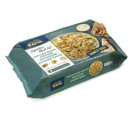 Try Giovanni Rana's Family-Sized Fettuccine Chicken Alfredo Sauce Premium Meal Kit in a 39oz tray. Made by Pastificio Rana, known for fresh pasta for over 60 years, it uses top-quality, non-GMO ingredients. The fettuccine has a rich golden color from extra eggs and cooks to a perfect 'al dente' texture. This kit is free from preservatives and artificial additives, bringing restaurant-quality taste to your home. Regular. Refrigerated. Refer to packaging for allergens.