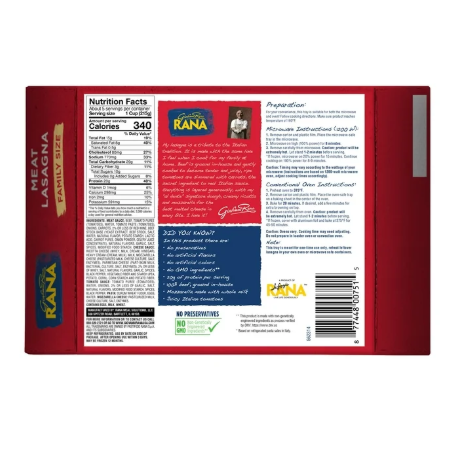 Giovanni Rana offers a premium Homestyle Meat Lasagna in a convenient 40oz tray, perfect for families. With over 60 years of experience, Rana creates superior products using non-GMO ingredients, many with D.O.P. certification. Unlike frozen varieties, Rana's refrigerated lasagnas preserve flavors and textures. Made fresh with natural ingredients and no preservatives, they boast restaurant quality. The Meat Lasagna features creamy ricotta, parmesan, and whole milk mozzarella. Fully cooked and ready in no time, it's ideal for a special family meal. Rana ensures high quality with BRC standards. Refrigerated.