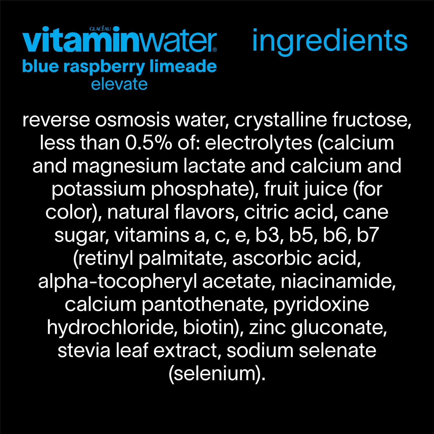 Elevate Blue Raspberry Limeade Ingredients: reverse osmosis water, crystalline fructose, lessthan 0.5% of: electrolytes (calcium and magnesium lactate and calcium and potassium phosphate). frultJuice (forcolor), natural flavors, citric acid, cane sugar, vitamins A, C, E, B3, B5, B6, B7 (retinyl palmitate, ascorbic acid, alpha-tocopheryl acetate, niacinamide, calcium pantothenate, pyridoxine hydrochloride, biotin), zinc gluconate, stevia leaf extract, sodium selenate (selenium).