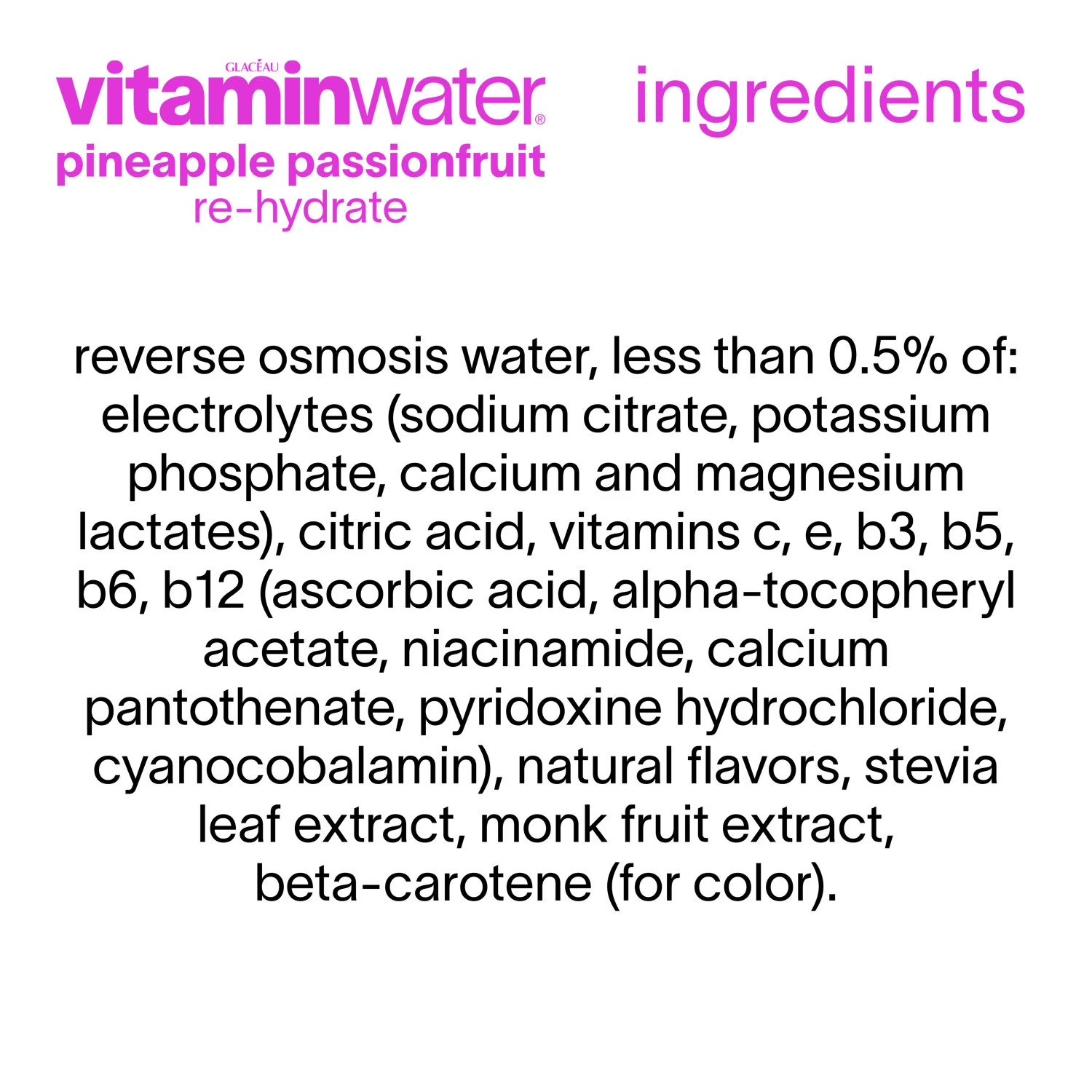 Re-Hydrate Pineapple Passionfruit Ingredients: reverse osmosis water, less than 0.5% of: electrolytes (sodium citrate, potassium phosphate, calcium and magnesium lactates), citric acid, vitamins C, E, B3, B5, B6, B12 (ascorbic acid, alpha-tocopheryl acetate, niacinamide, calcium pantothenate, pyridoxine hydrochloride, cyanocobalamin), natural flavors, stevia leaf extract, monk fruit extract, beta-carotene (for color).